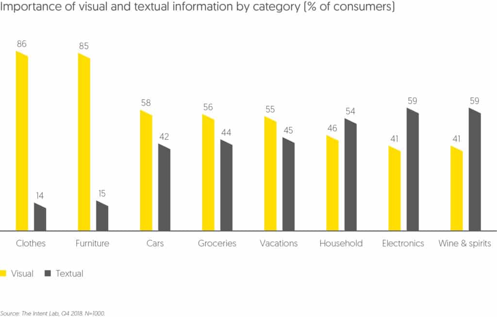 The Intent Lab, a research partnership between Performics and Northwestern University, found that 36% of consumers This research reveals that shoppers want visual content to have conducted a visual search. 59% of consumers think that aid decision-making across the consumer journey, especially visual information is more important than textual information, when they’re close to purchase. This visual content must across all categories. Respondents were most reliant on align with consumer mind-sets at the relevant moments in visual information in the clothing and furniture categories. the shopping journey.