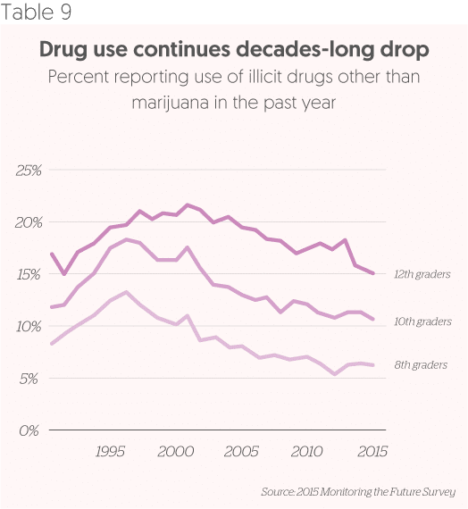Teenagers start drinking alcohol later and are getting drunk less often. Since 1998, the age when young Australians first try alcohol has risen from 14.4 to 16.1. Since 2002, the proportion of 15-yearolds getting drunk more than once has more than halved (see table 8). In the UK, 20% of 16-24s are teetotal. Teenage drug use of any sort is also falling, including alcohol, tobacco, cannabis, inhalants and sedatives, dropping from 89% to 69% in Sweden and 77% to 39% in Iceland (see table 9).