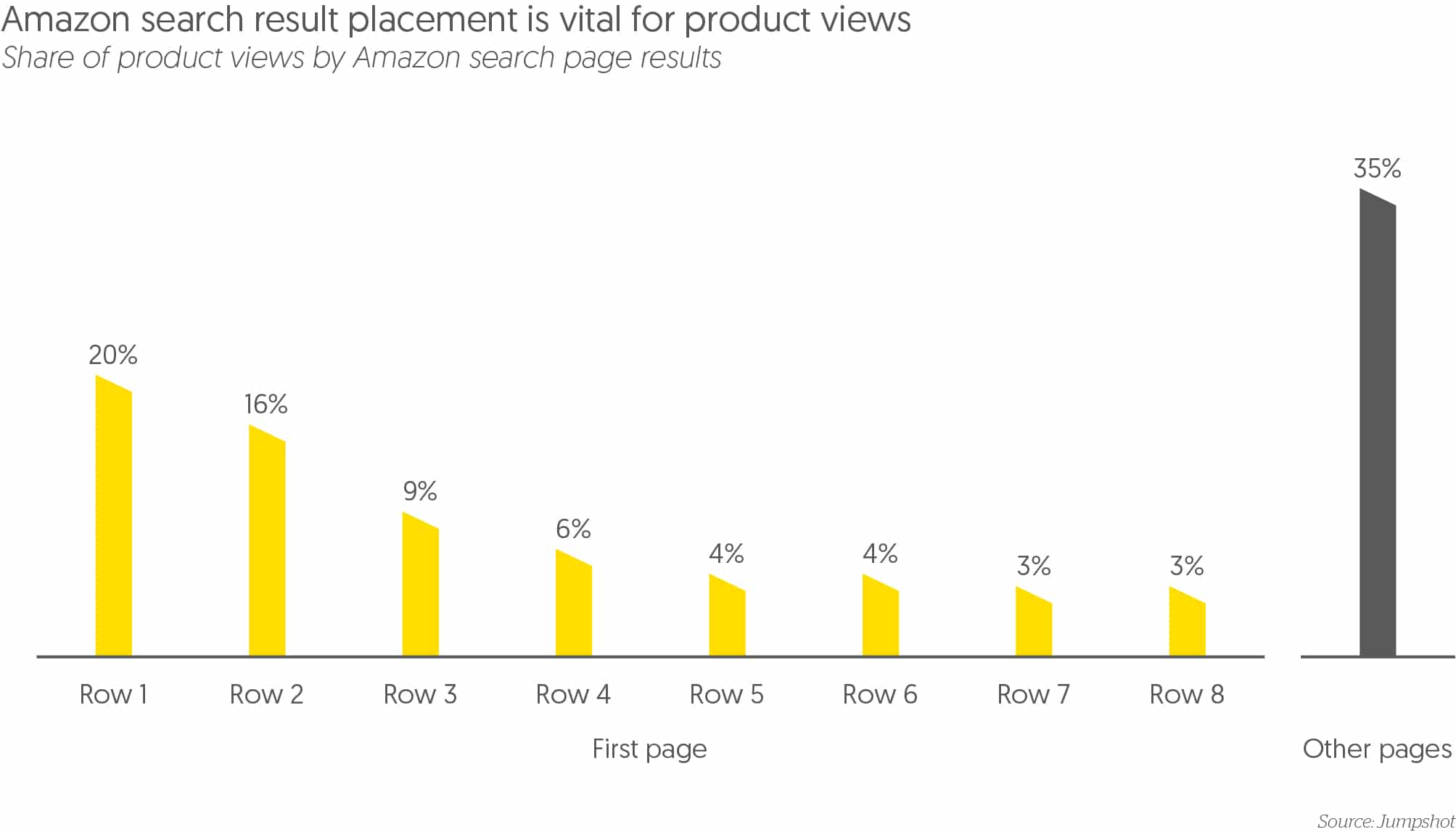 Amazon is rapidly developing its advertising services, forcing brands to reconsider how they budget for e-commerce. It offers several ways for brands to promote themselves on its platform, such as display ads and sponsored products in search results. Since 86% of visits to product pages come from search, sponsored products are currently the best way to attract the attention of Amazon shoppers. According to Jumpshot, only 7% of clicks were on sponsored products in May 2018, but that was up from 5% in January, and the number of clicks on sponsored products increased by 17% over this period. Brands are rapidly increasing their spend as competition for the most prominent positions heats up: 20% of all clicks come from the top row of results.