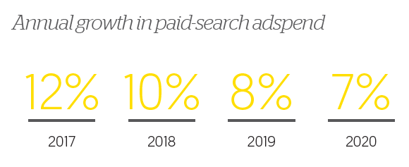 Global search marketing spend is decelerating but still growing healthily. Search is a behavioural-insights goldmine for brands: the language that consumers use in their search queries indicates where they are in the purchase journey. Brands are harnessing these insights, driving more investment in the channel to align search experiences with consumer intent.
