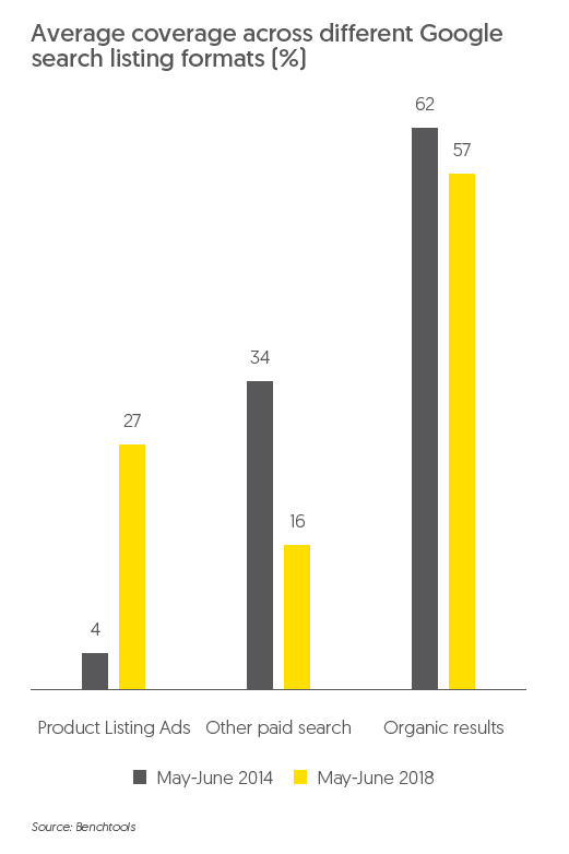 Benchtools, our proprietary search monitoring tool, shows that Product Listing ads took up 27% of the typical search results page on Google UK in May-June 2018, up from just 4% in May-June 2014. Most of this coverage was taken from other paid search results, but some came from the organic search results, which have become less prominent over time.