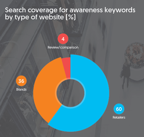 to support the notion that searches in the awareness stage can, and do, lead to purchase. Using Benchtools, we recently monitored paid and organic listings around keywords related to running shoes. We noticed that for “awareness” search terms, retailers accounted for 60% of